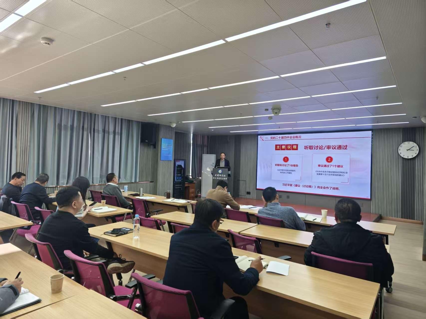 陳世龍作了《深入學(xué)習(xí)貫徹習(xí)近平總書記在黨的二十屆四中全會上的重要講話和全會精神》黨課報告,他從黨的二十屆四中全會概況、習(xí)近平總書記在黨的二十屆四中全會上的重要講話和全會公報主要內(nèi)容、黨的二十屆四中全會精神要點(diǎn)解讀、中國科學(xué)院黨組學(xué)習(xí)貫徹全會精神的部署要求和西北高原所黨委學(xué)習(xí)貫徹全會精神的工作要求五個方面進(jìn)行詳細(xì)解讀。他指出,黨的二十屆四中全會是在我國改革發(fā)展關(guān)鍵時期召開的一次重要會議,全會審議通過的相關(guān)文件,為新時代堅(jiān)持和完善中國特色社會主義制度、推進(jìn)國家治理體系和治理能力現(xiàn)代化指明了前進(jìn)方向、提供了根本遵循。